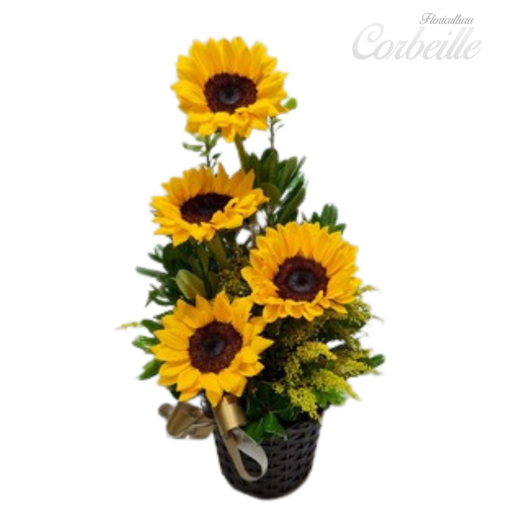 Lindo vaso com 4 belos girassóis que formam um bonito e forte arranjo, todo preparado a mão com flores originais e de qualidade na floricultura Corbeille