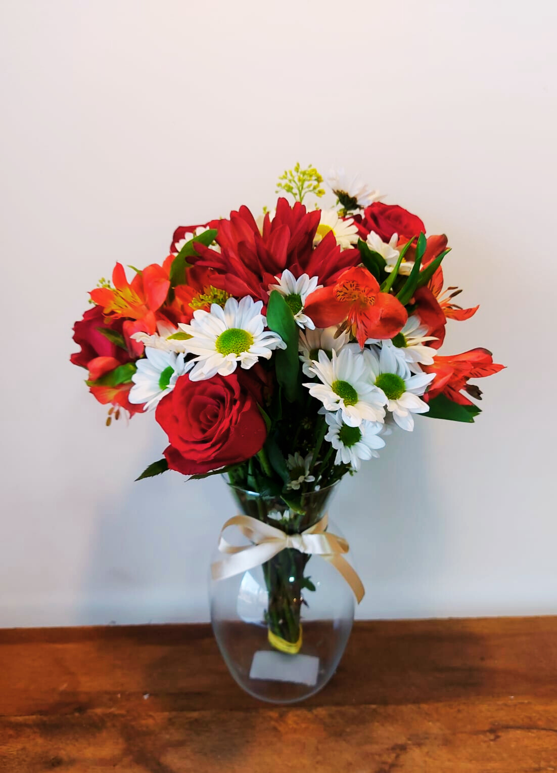 Um delicado arranjo com lindas rosas nacionais de primeira qualidade, astromelias, margaridas e folhagens, em um vaso lindo para você presentear com emoção e praticidade. Flores sempre frescas e selecionadas por nossos floristas locais.
