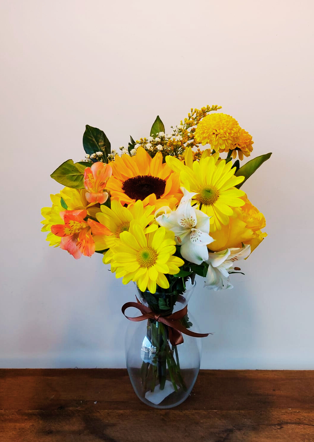 Um delicado arranjo com lindas rosas nacionais de primeira qualidade, girassol, astromelias, margaridas e folhagens, em um vaso lindo para você presentear com emoção e praticidade. Flores sempre frescas e selecionadas por nossos floristas locais.
