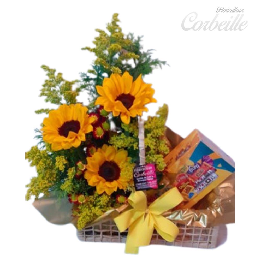 Linda cesta com formosos girassóis todos selecionados e trabalhados a mão, acompanhado de uma deleciosa caixa de bombom garoto, tudo perfeito para deixar esse momento ainda mais especial