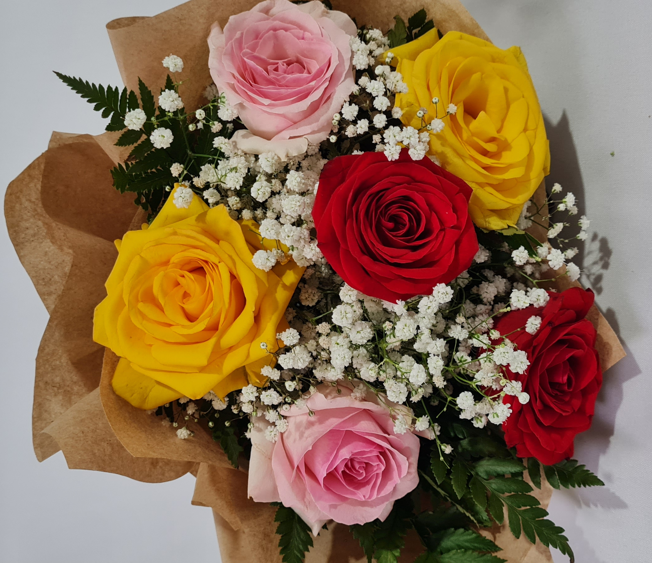 Em estilo tradicional, embalado e com laço, este belo buquê de rosas coloridas traz as cores e a beleza da natureza para você encantar enviando sua mensagem de amor e carinho para surpreender em datas especiais. Este elegante buquê é apresentado com 6 lindas rosas coloridas e folhagens.